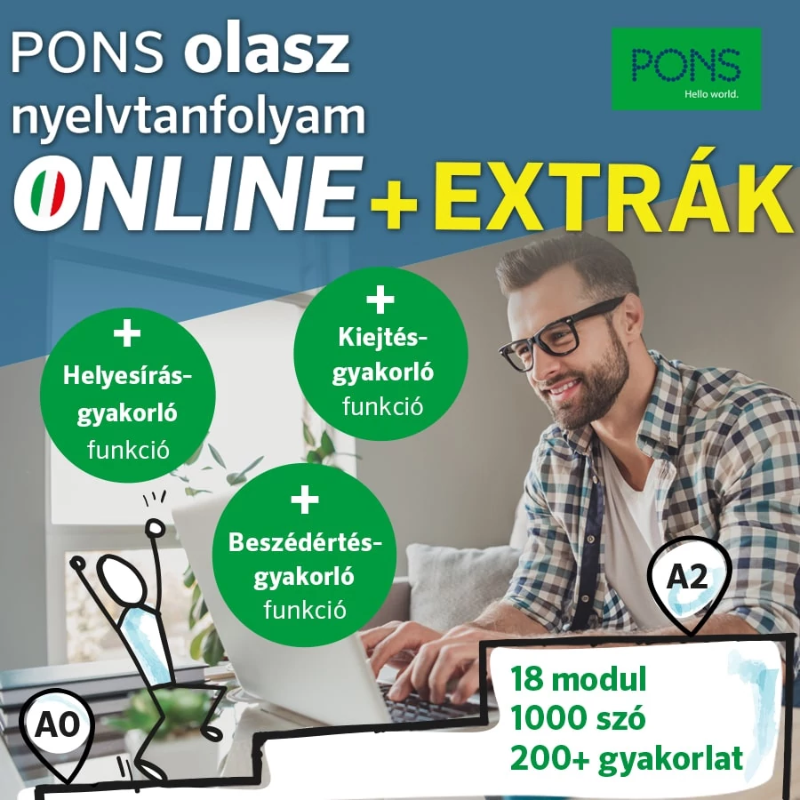 A PONS-nál új szintre emeltük az online nyelvtanulást! Az Olasz nyelvtanfolyam online + EXTRÁK olyan új, egyedi és interaktív funkciókkal bővítette ki alap olasz online nyelvtanfolyamunkat, amellyel egyszerűbb és hatékonyabb lesz az online olasz nyelvtanulás, így még könnyebben tudsz önállóan alap olasz nyelvtudást szerezni. Ha olasz nyelvtanulás, akkor a PONS a megoldás.